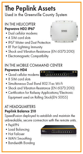 The system provides a steady broadcast quality video from the helicopter to both headquarters and the mobile command center, with a less than a two second delay. Over a secure CDN, the video streams are also shared to department cell phones and to other first responders. The Greenville Sheriff’s Department shares their aerial observation abilities with other agencies through a mutual aid agreement. With a FLIR camera, the chopper shows firefighters on the ground real-time thermal images from the air. The Pepwave outfitted Bell helicopter has been dispatched beyond Greenville to assist with other efforts including hurricane response. From any remote location the HD2 in the chopper can send video back to headquarters, and from there to anywhere in the world.